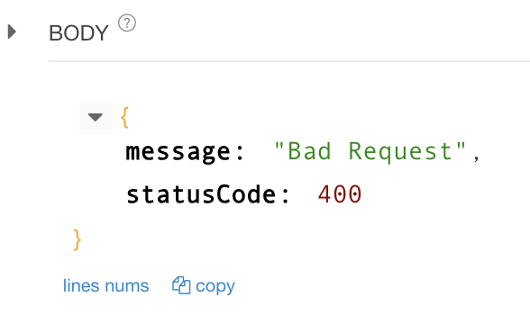 리턴되는 id의 타입이 number로 바뀌었다. 추가적으로 인스턴스가 아닌 클래스를 생성하여 생성자로 에러 주입도 가능하다. 이전에 셋팅했던 Exception Filters를 통해서 출력이 되는것을 확인할 수 있다.