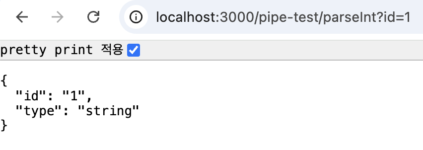 지금 반환하는 id의 타입이 number로 지정해주었지만 string으로 나온다. 이제 여기서 코드를 수정하여 ParseIntPipe를 사용해보자.