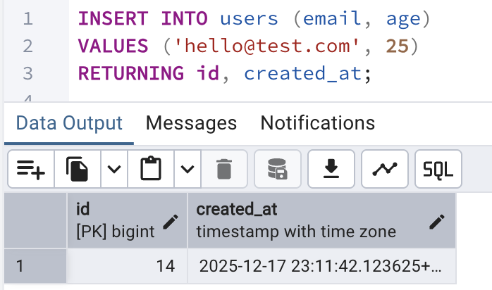RETURNING id, created_at;