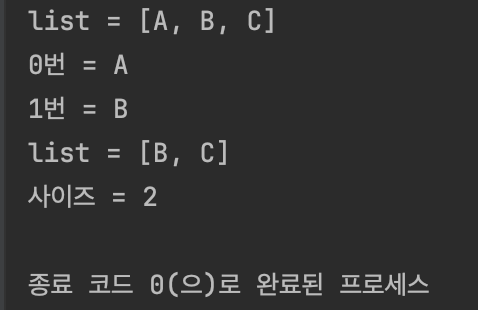 list.remove(0); // A 삭제
