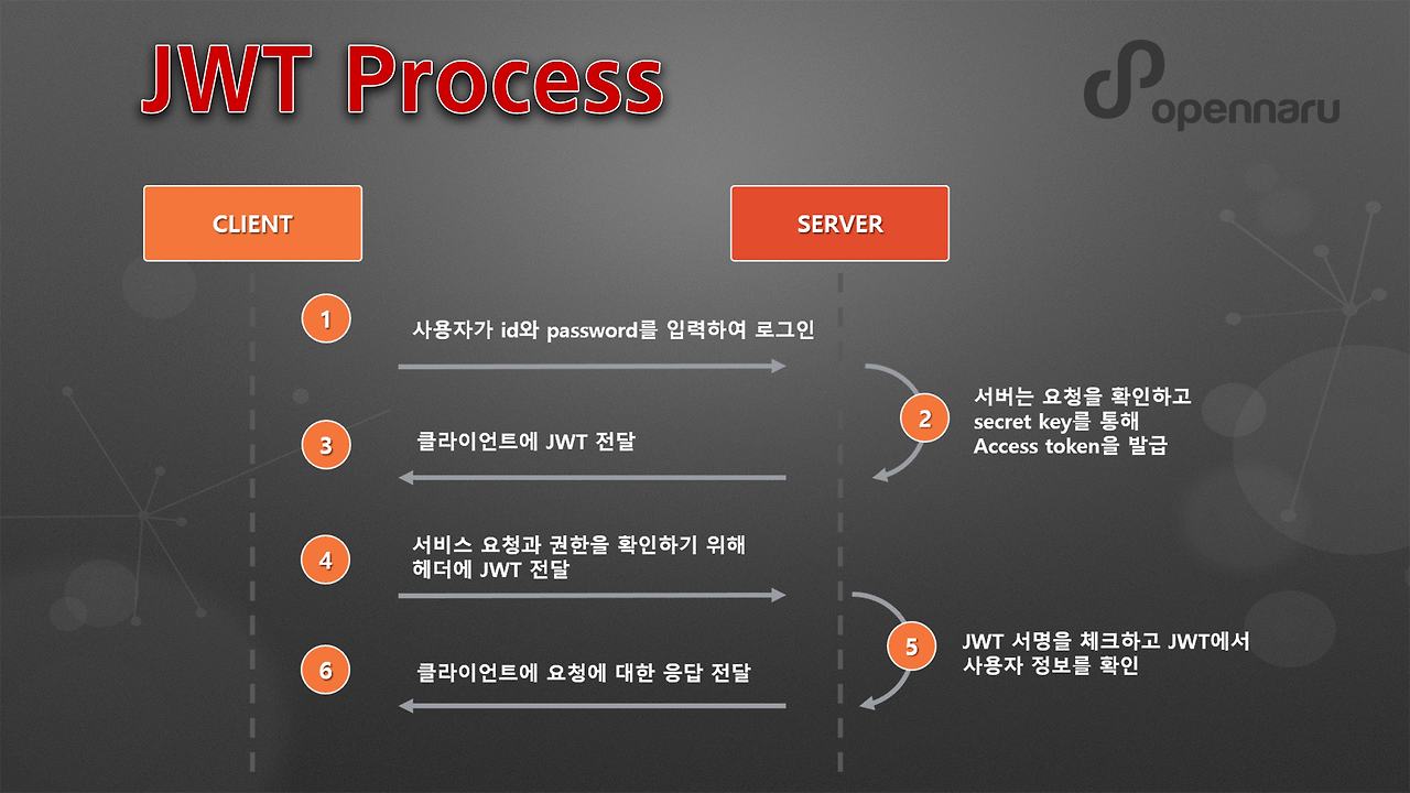 이전 포스팅에서는 사용자가 로그인에 성공했을 때 JWT 토큰을 발급하는 과정에 대해 다뤘다. 하지만 실제 서비스에서는 단순 발급만으로는 충분하지 않다. 클라이언트가 발급받은 토큰을 서버 요청과 함께 전달하면, 서버는 이를 기반으로 사용자가 해당 API를 호출할 권한이 있는지 판단할 수 있다. 이번 포스트에서는 JWT 토큰을 활용한 인증(Authentication)과 인가(Authorization) 과정을 NestJS를 중심으로 살펴보고, 실제 API 요청에서 어떻게 안전하게 권한을 확인할 수 있는지 테스트 해보자. 이전 과정은 3번까지 였다면 이번에 하는 과정은 4번부터 6번까지이다. 헷갈리지 말자.