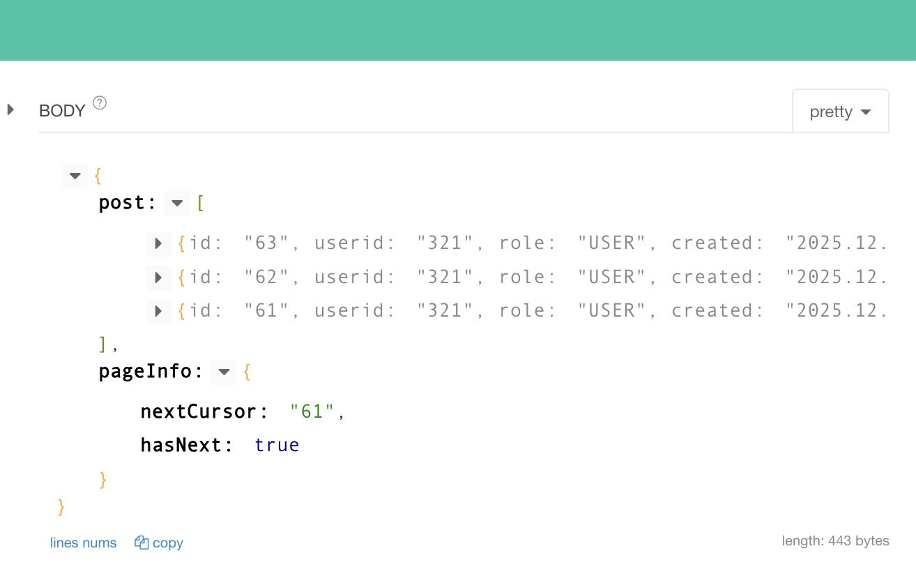 첫 요청에서는 가장 최신 게시글 20개를 조회한다. 그리고 응답 결과의 마지막 id 값을 다음 요청의 커서로 사용한다.