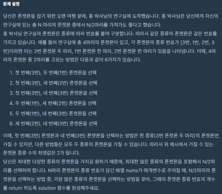 - 전체 폰켓몬 중에서 N/2 마리만 선택할 수 있다.